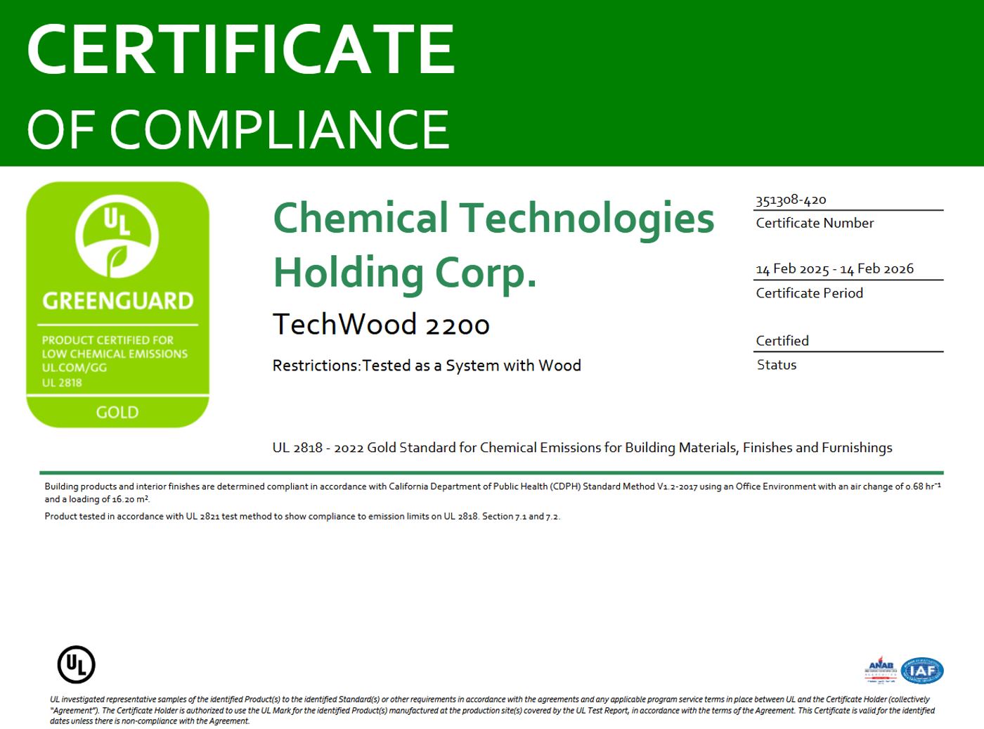 UL 2818-2022 Gold Standard for Chemical Emissions for Building Materials, Finishes and Furnishings. Building products and interior finishes are determined compliant in accordance with California Department of Public Health (CDPH) Standard Method V1.2-2017 using an Office Environment with an air change of 0.68 hr¯¹ and a loading of 16.20 m². Product tested in accordance with UL 2821 test method to show compliance to emission limits on UL 2818. Section 7.1 and 7.2.